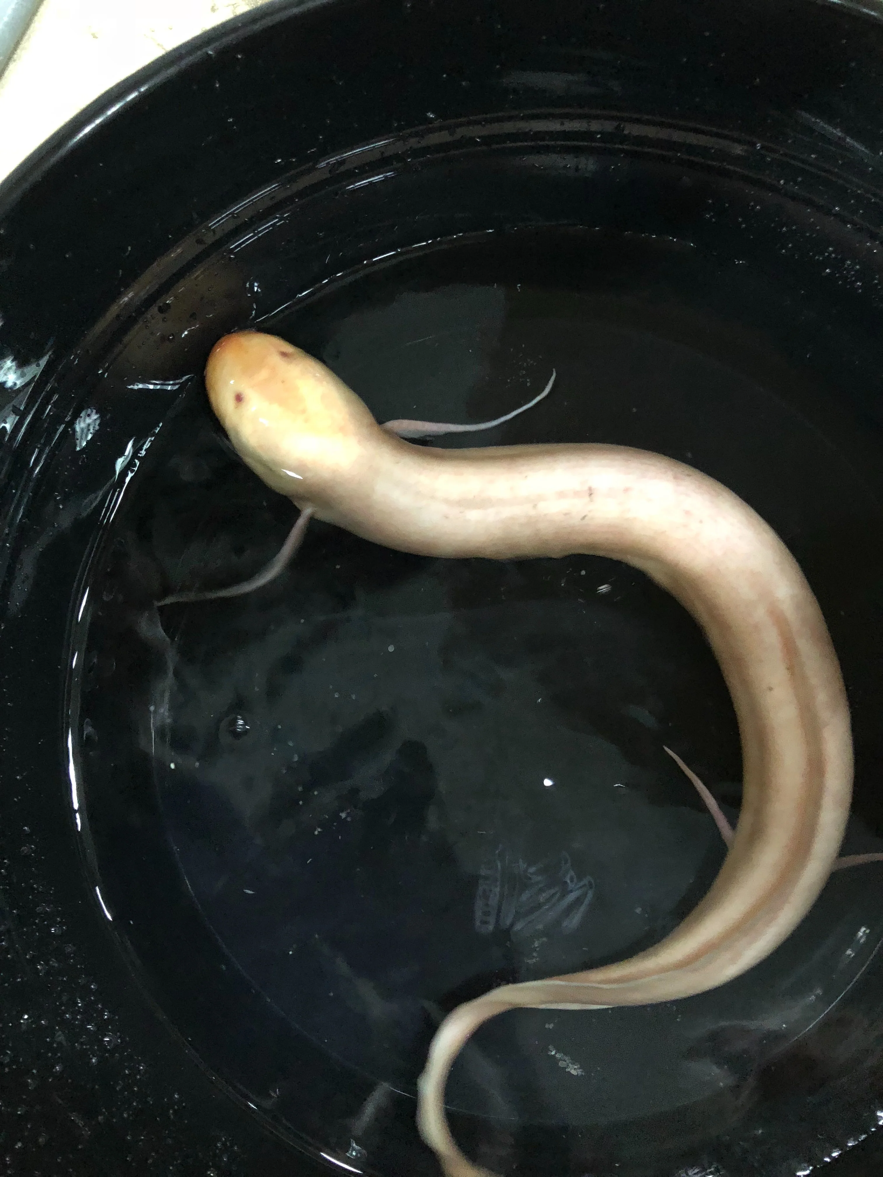 The closest living relatives of tetrapods, lungfish often live in anoxic shallow swamps and ponds, which are likely to dry up in the dry season, so these fish have evolved as obligate air breathers and can endure long periods out of water, holed up in burrows in the dried mud. To breathe air, the lungfish’s air bladder has evolved into a “lung,” a highly vascularized pocket of the digestive tract, in which gulped air can be stored to oxygenate the blood that runs through this organ. Their heart is also adapted to pumping oxygenated and de-oxygenated blood in separate streams to different parts of the body. The lungfish ear is highly developed, much like the tetrapod ear, and adapted to hearing through air rather than water. Elongate and eel-like in appearance, African lungfish have soft scales and their pelvic fins are modified into long threadlike appendages which they can use to crawl along muddy surfaces. They are carnivorous, eating invertebrates, fish and amphibians. Lungfish are eaten by native Africans, although they have a strong taste, and are thus not widely enjoyed. Because of increased fishing pressure and conversion of breeding habitats to agriculture, populations of marbled lungfish are on the decline in Lake Victoria and Lake Nabugabo.