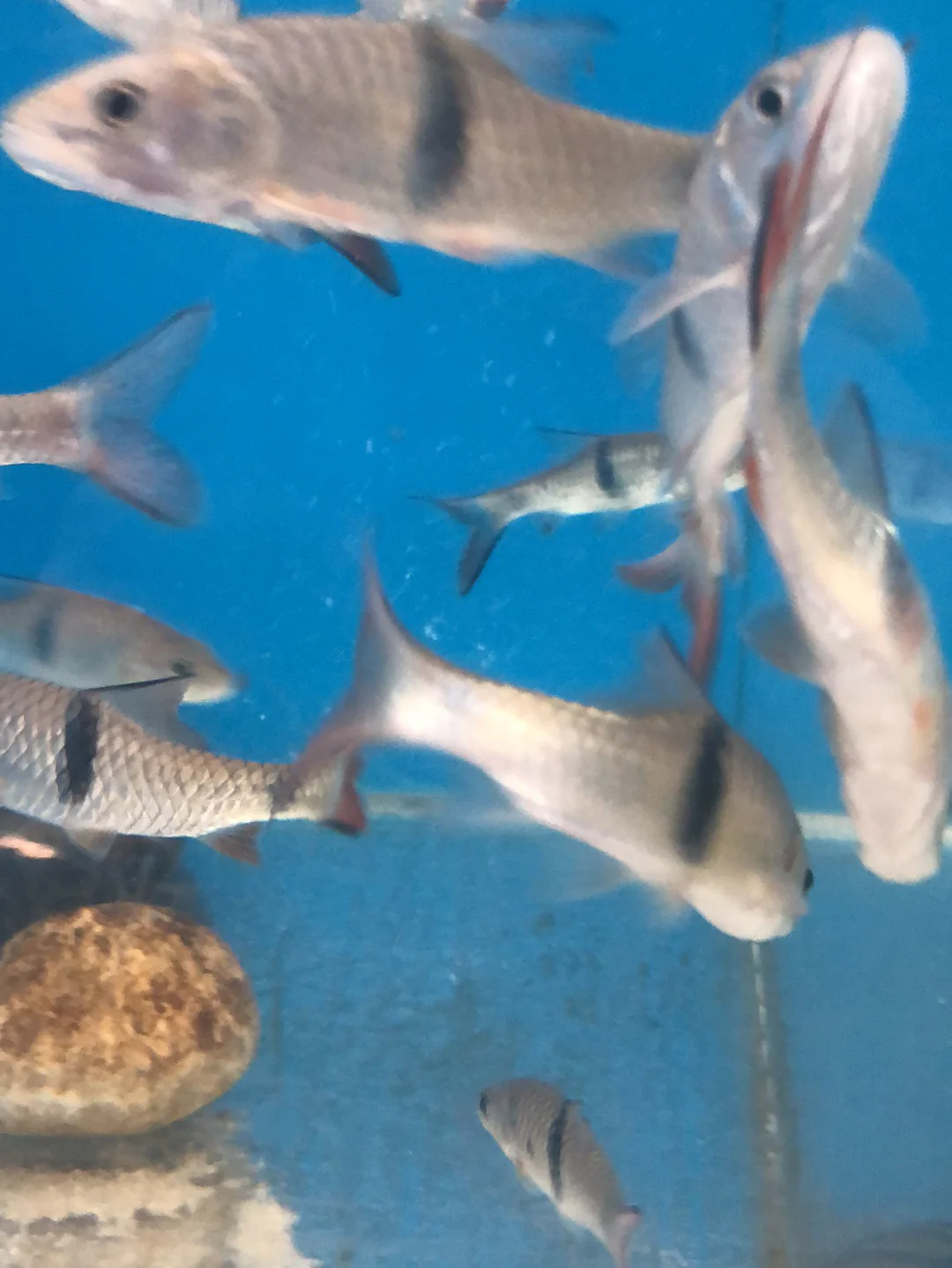 The hampala barb (Hampala macrolepidota) is a relatively large southeast Asian species of cyprinid from the Mekong and Chao Phraya basins, as well as Peninsular Malaysia. They can reach up to 2 feet. They have a very colorful tail and distinct black bar on the body.